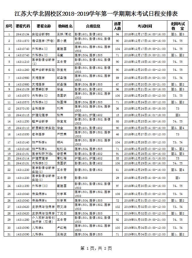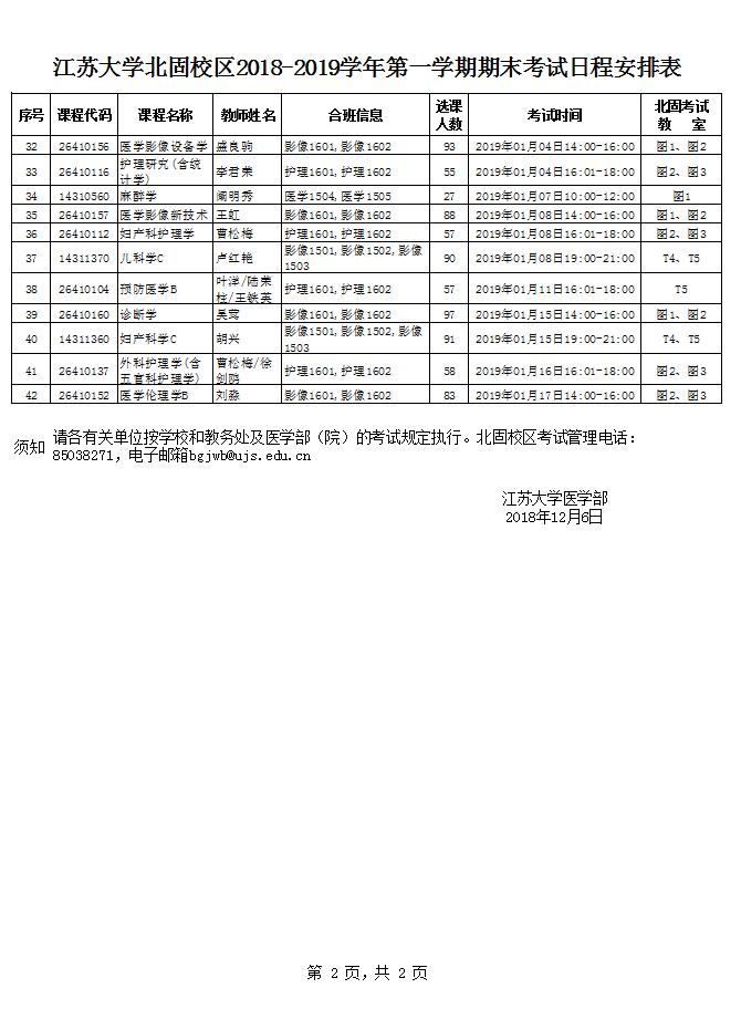 北固校区2018-2019学年第一学期期末考试日程安排表