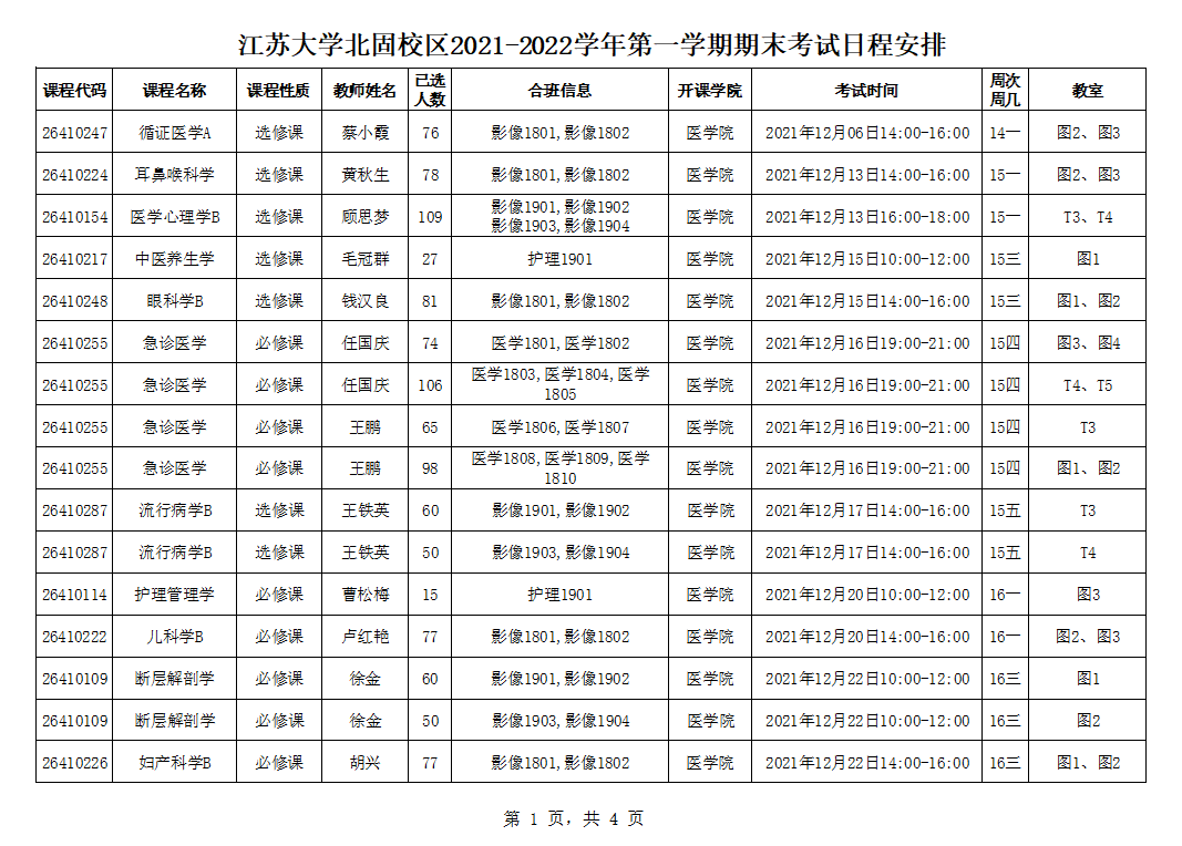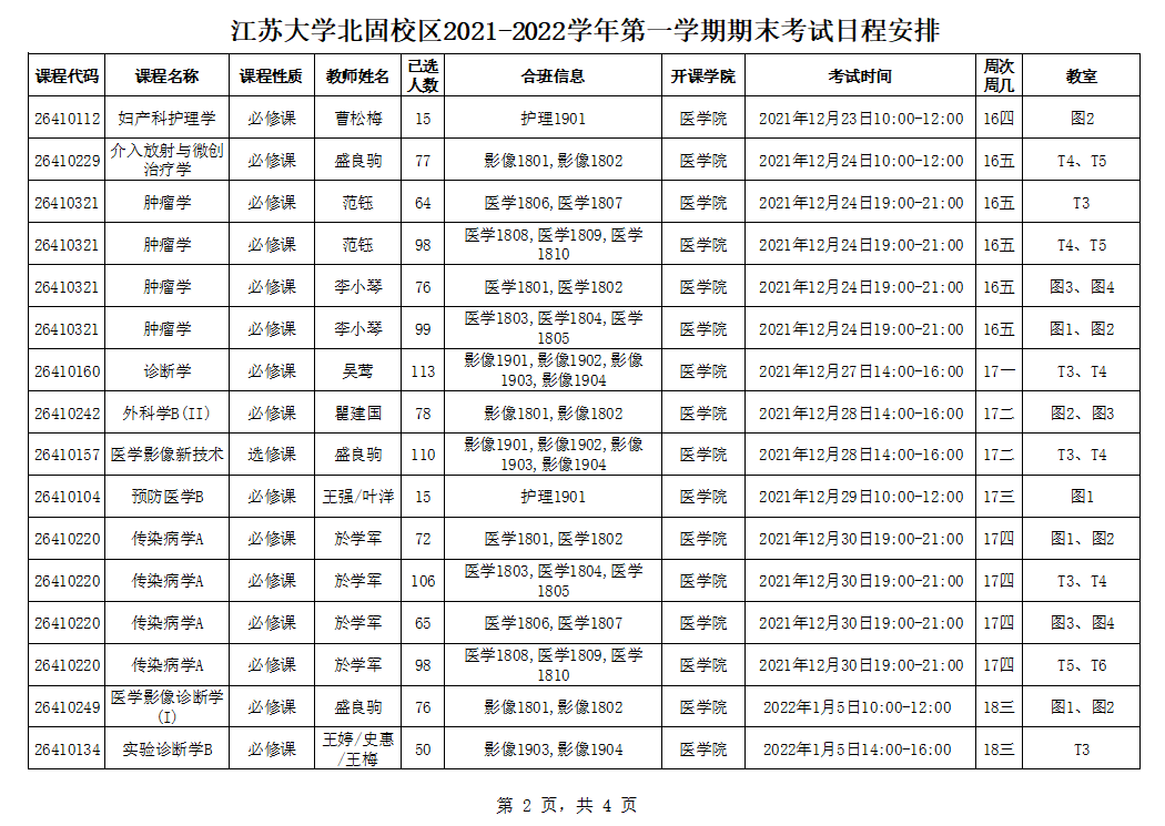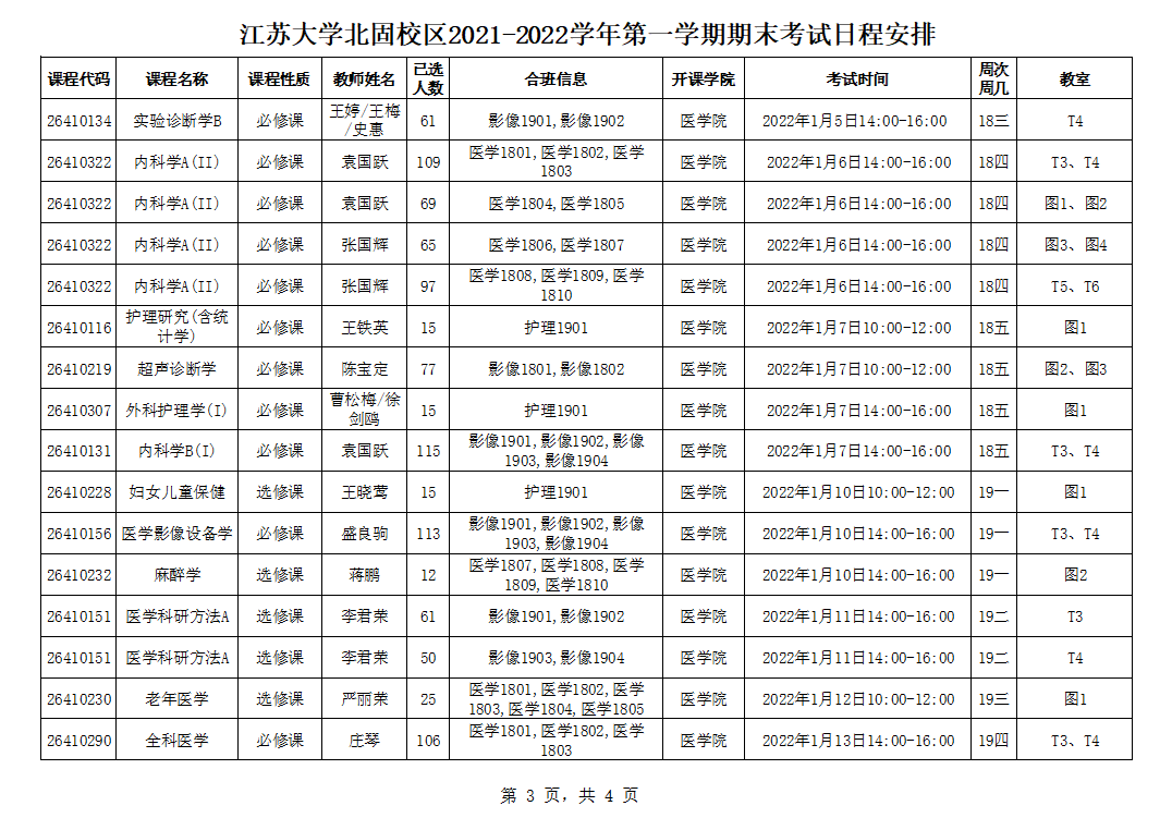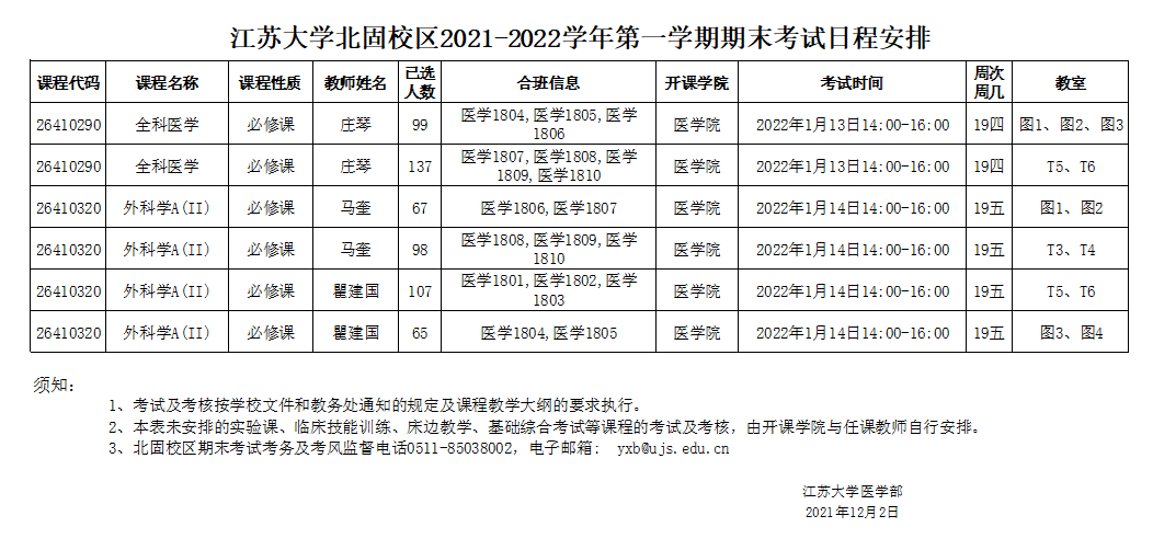 北固校区2021-2022学年第一学期期末考试安排