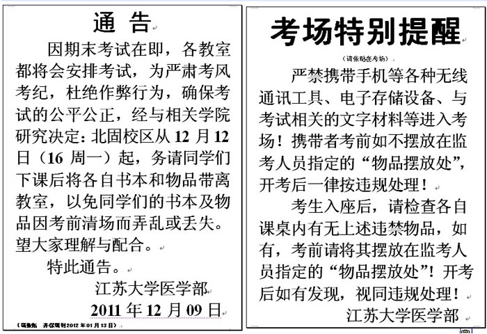 北固校区本学期期末考试考场特别提醒及此间教室使用通告