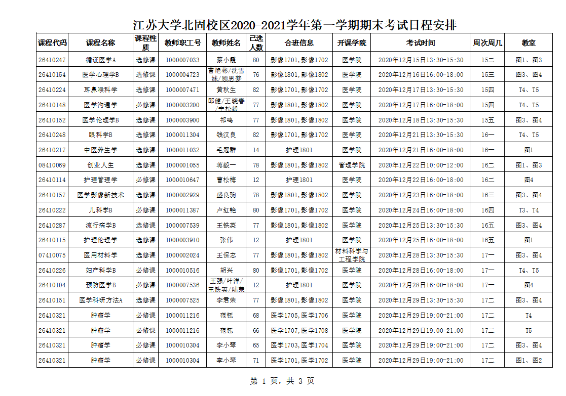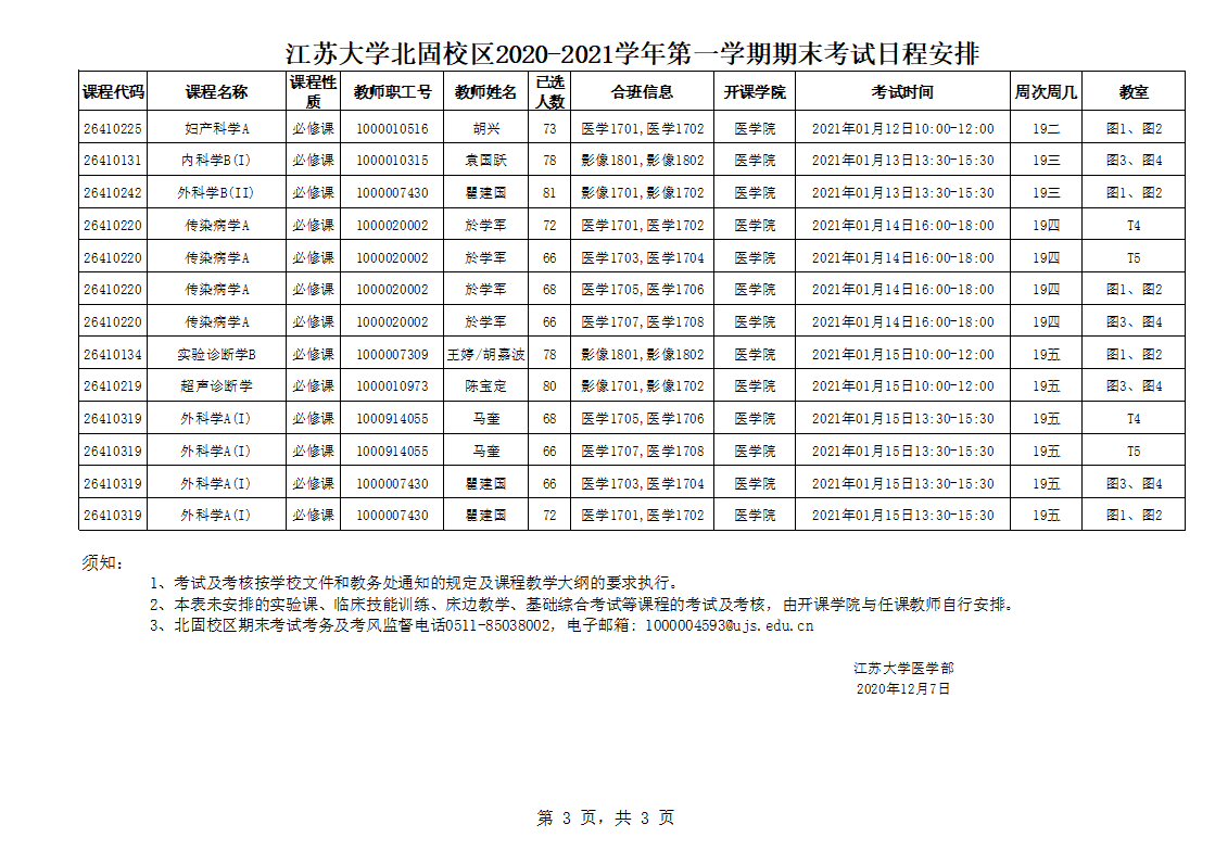 北固校区2020-2021学年第一学期期末考试安排